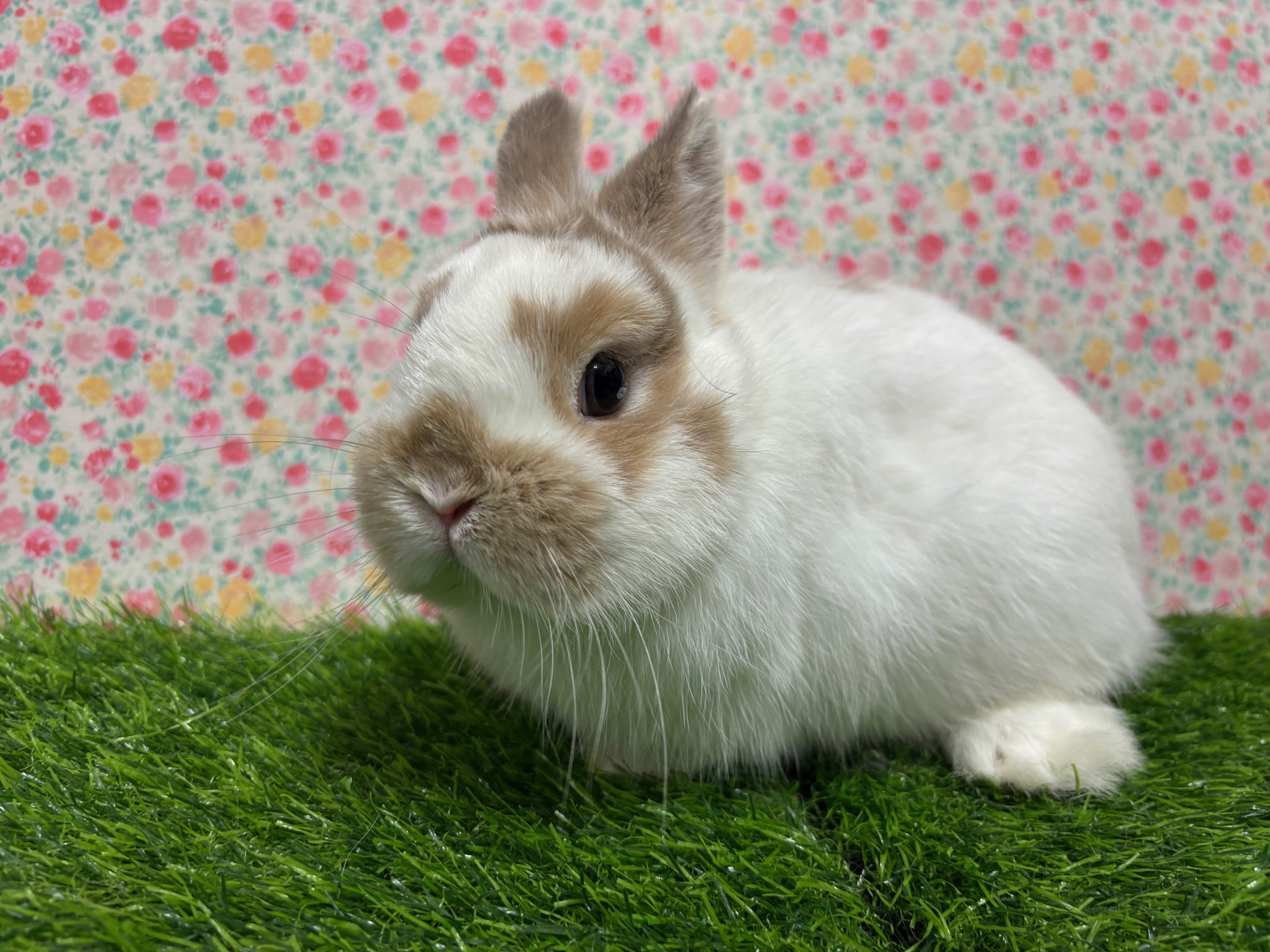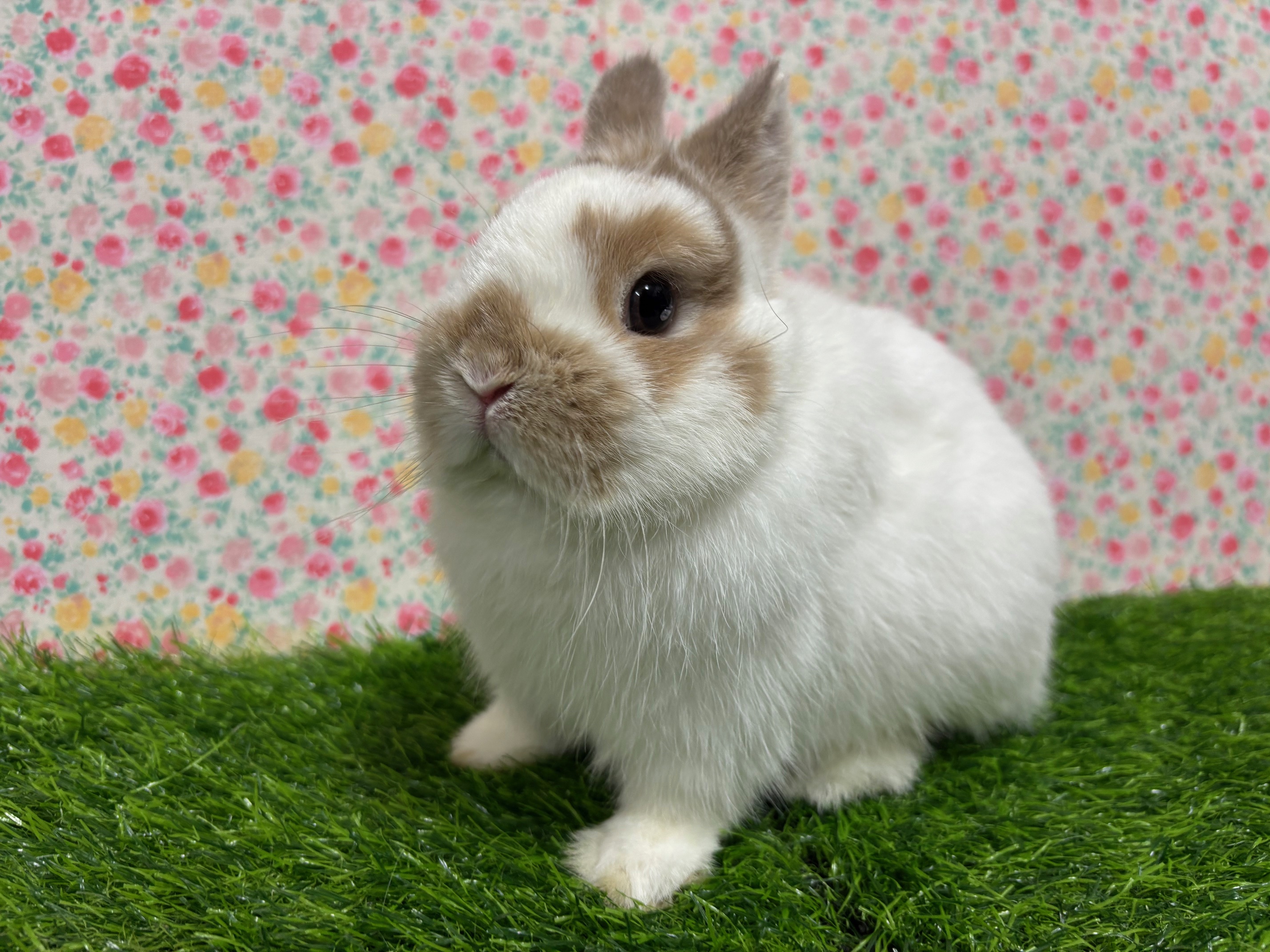 <2025年12月18日撮影>好奇心旺盛な男の子で散歩好きです。パパのオリオンくん譲りの可愛いまる顔と短い耳が特徴です。小さい頃からよく食べている生牧草が大好物です。